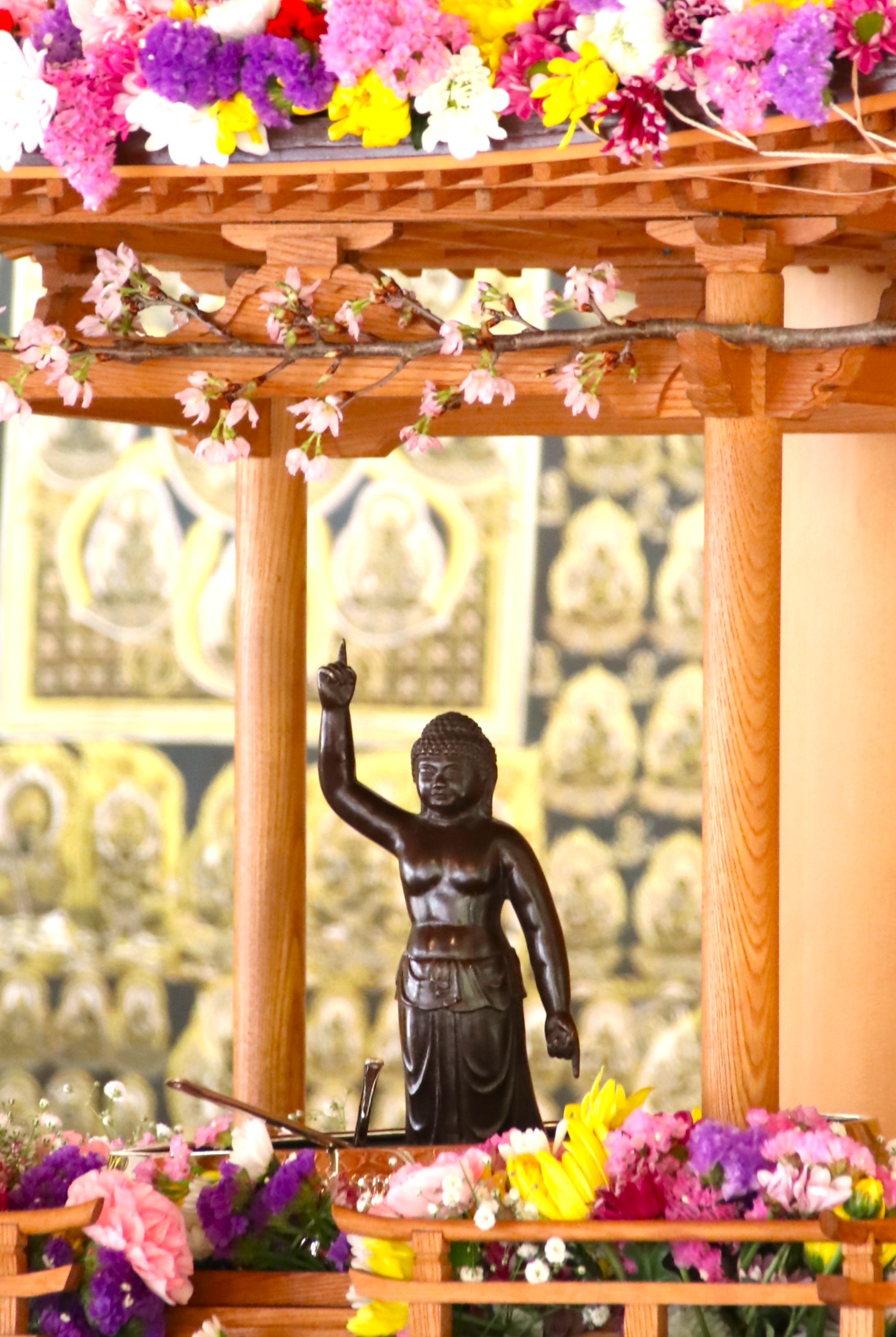 午前9時より、真如三昧耶堂で、お釈迦様の誕生を祝う、花祭り・釈尊降誕会法要が行われます。釈尊誕生仏に甘茶を掛けてご供養して頂けます。その後、甘茶のご接待もございます。